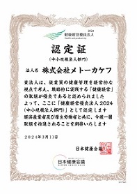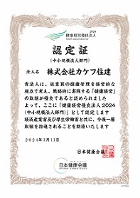 カケフグループ5社は、経済産業省および日本健康会議が運営する健康経営優良法人認定制度において「健康経営優良法人2024(中小規模法人部門)」に認定されました。