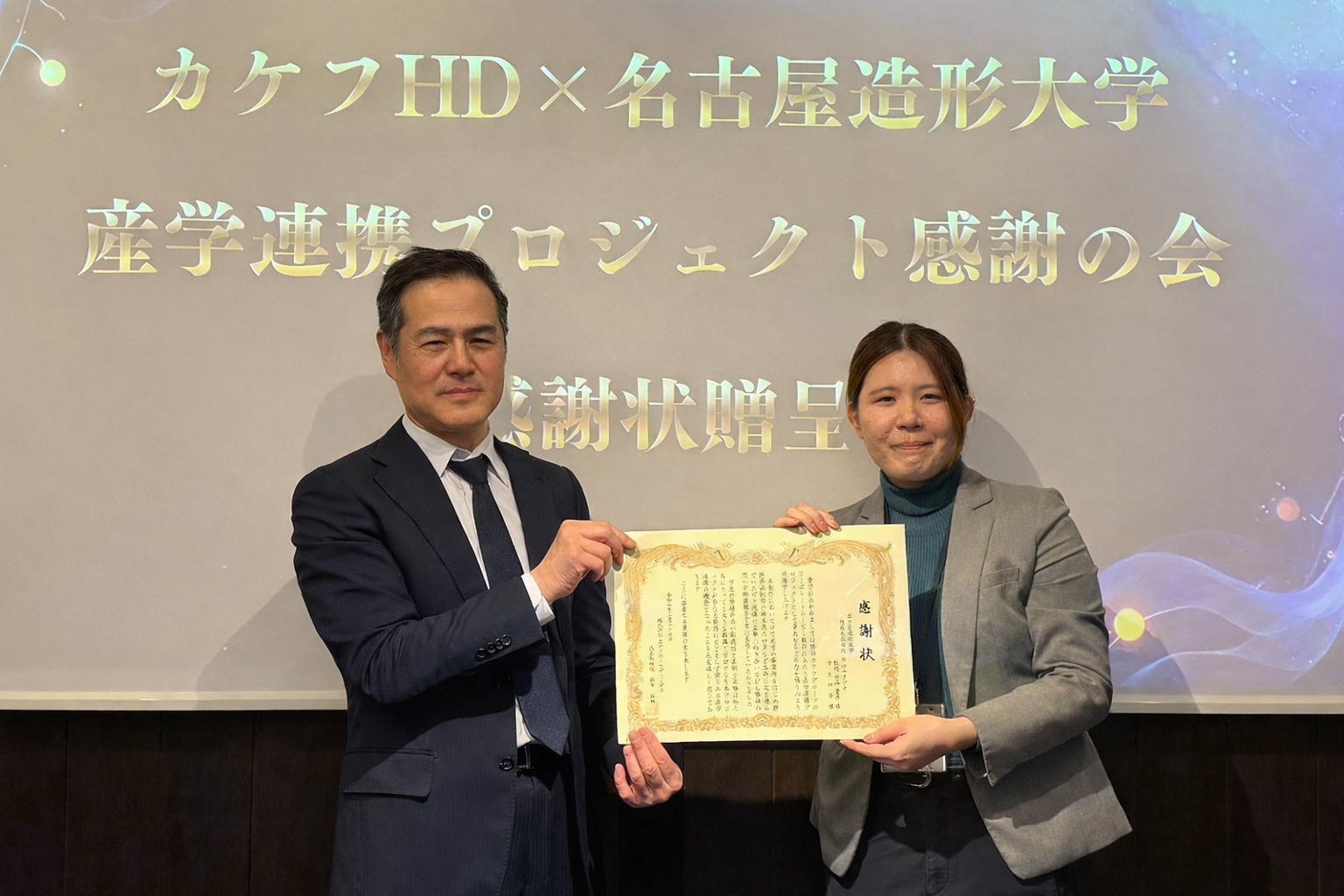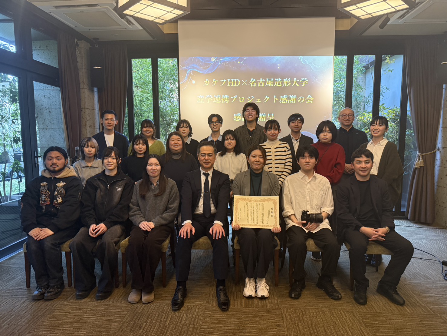 このたび、株式会社カケフホールディングスは、名古屋造形大学との産学連携プロジェクトにおいて制作いただいたコーポレートムービーの完成を受け、2026年2月26日、関係者をお招きして感謝の会を開催し、感謝状を贈呈しました。